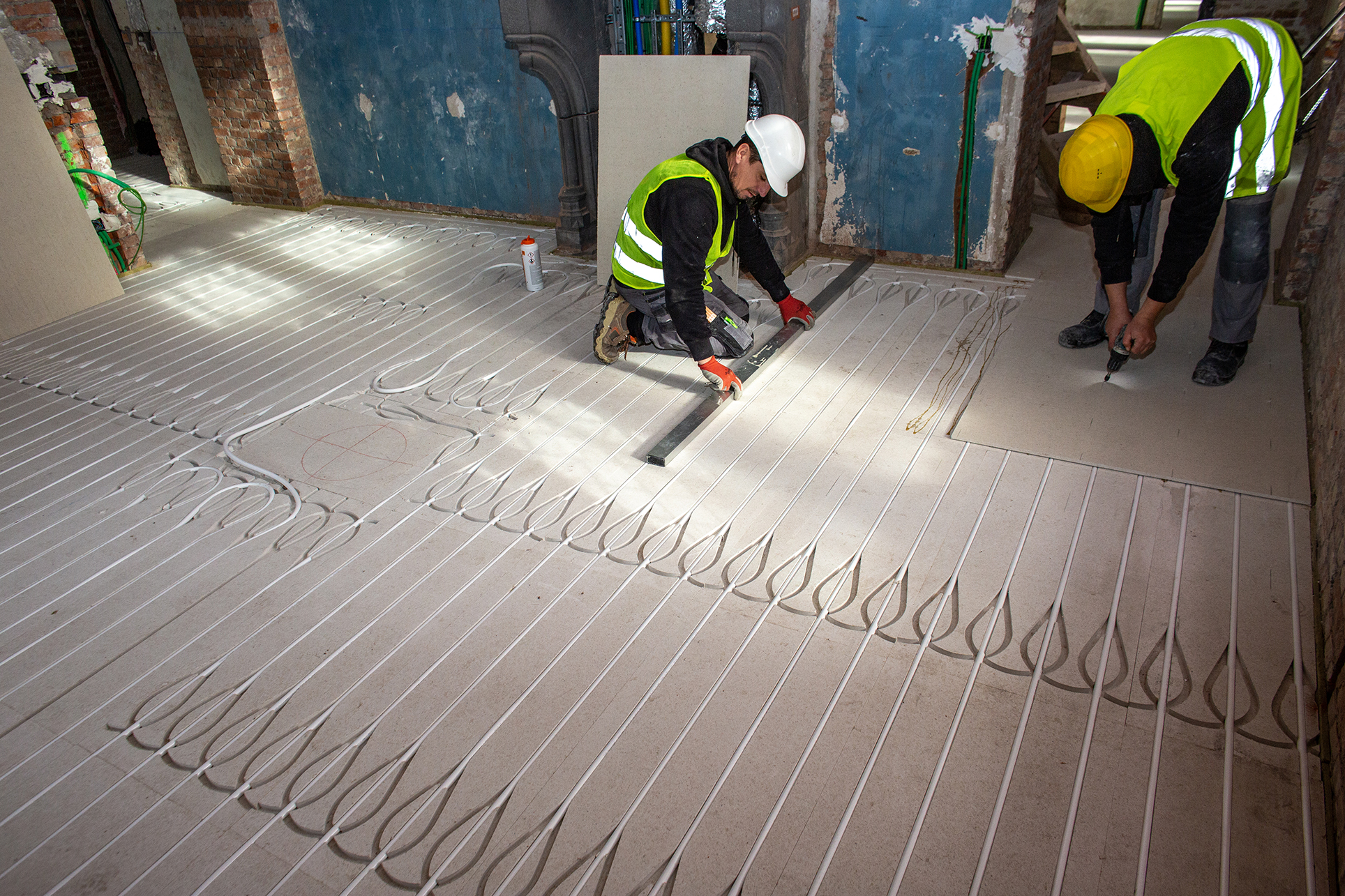 Dankzij de hoge dichtheid en stabiliteit van fermacell® Gipsvezelplaten kunnen leidingsleuven nauwkeurig en veilig worden aangebracht voor het realiseren van vloerverwarming, mits gebruik wordt gemaakt van de daarvoor geschikte fermacell® Vloerelementen.